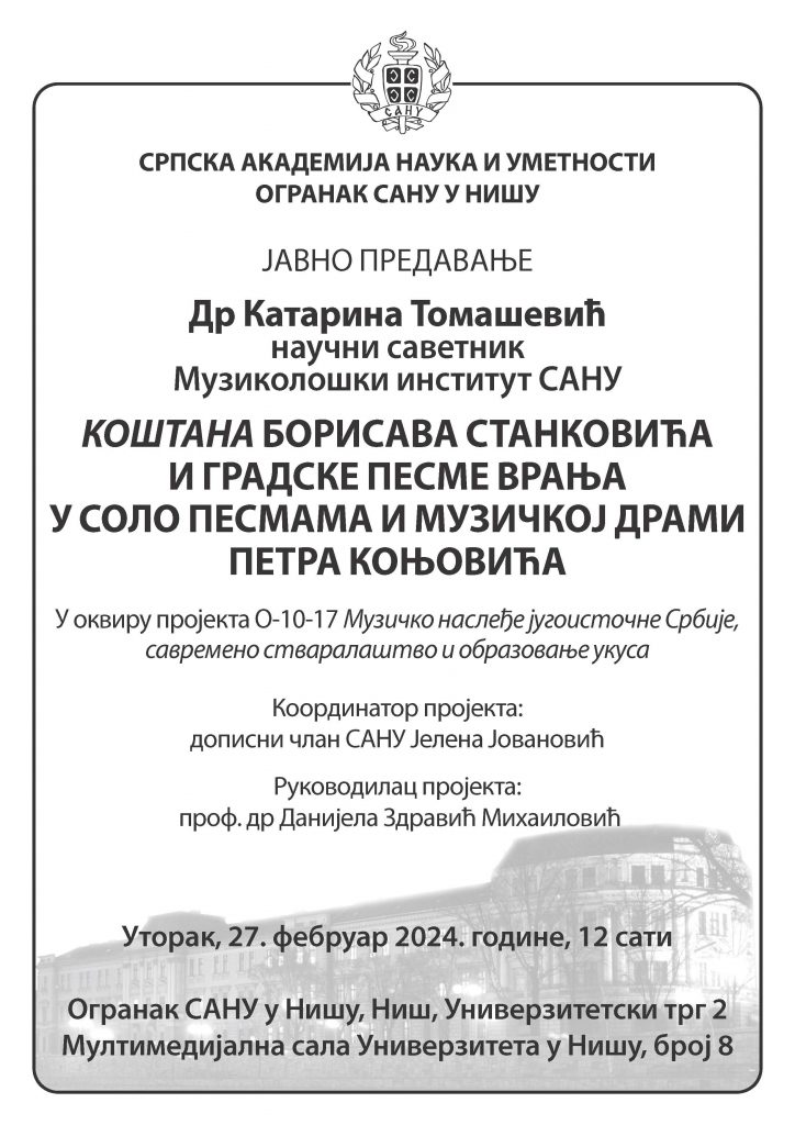 Др Катарина Томашевић, научни саветник, директор Музиколошког института САНУ, одржаће предавање на тему „Коштана Борисава Станковића и градске песме Врања у соло песмама и музичкој драми Петра Коњовића“. Предавање се реализује у оквиру пројекта О-10-17 Музичко наслеђе југоисточне Србије, савремено стваралаштво и образовање укуса (координатор пројекта: дописни члан САНУ Јелена Јовановић, руководилац пројекта: проф. др Данијела Здравић Михаиловић).