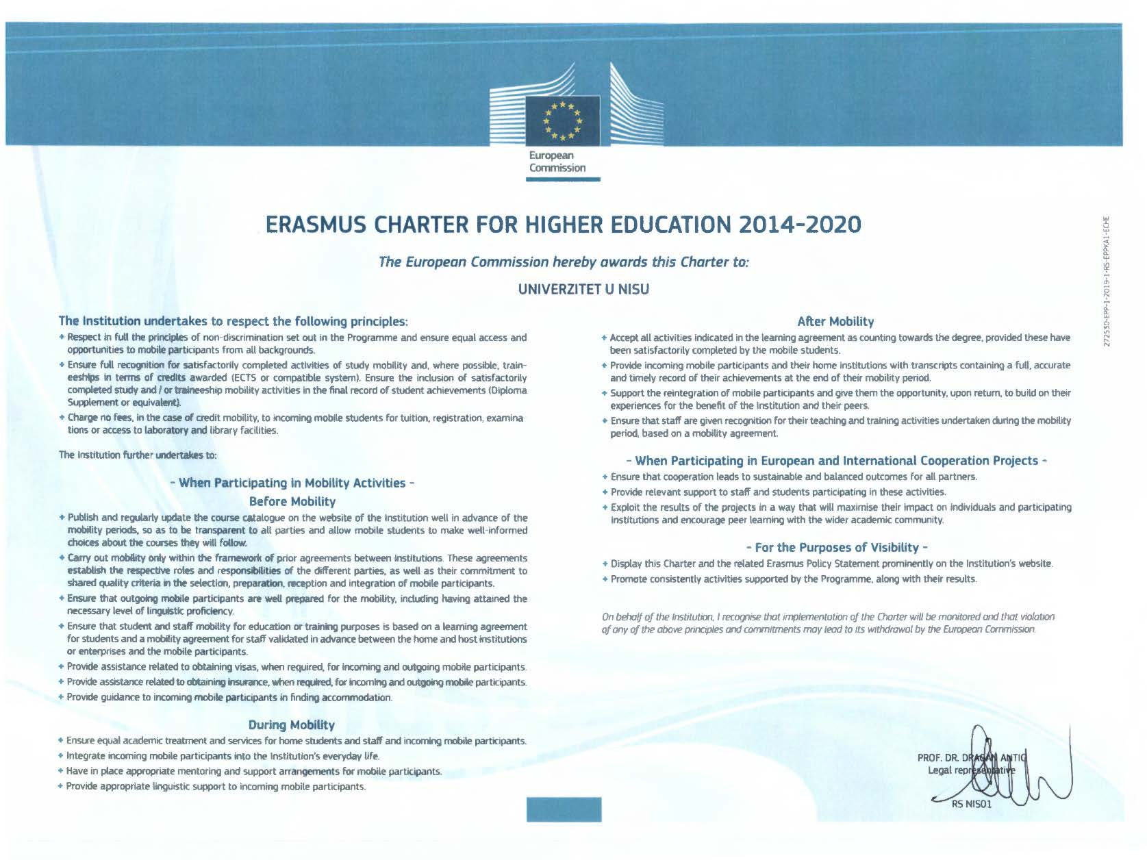 Стицањем Ерасмус повеље ( Erasmus Charter for Higher Education 2014-2020), Универзитет у Нишу добио је још једно изузетно признање за свој квалитетан рад у области интернационализације.
