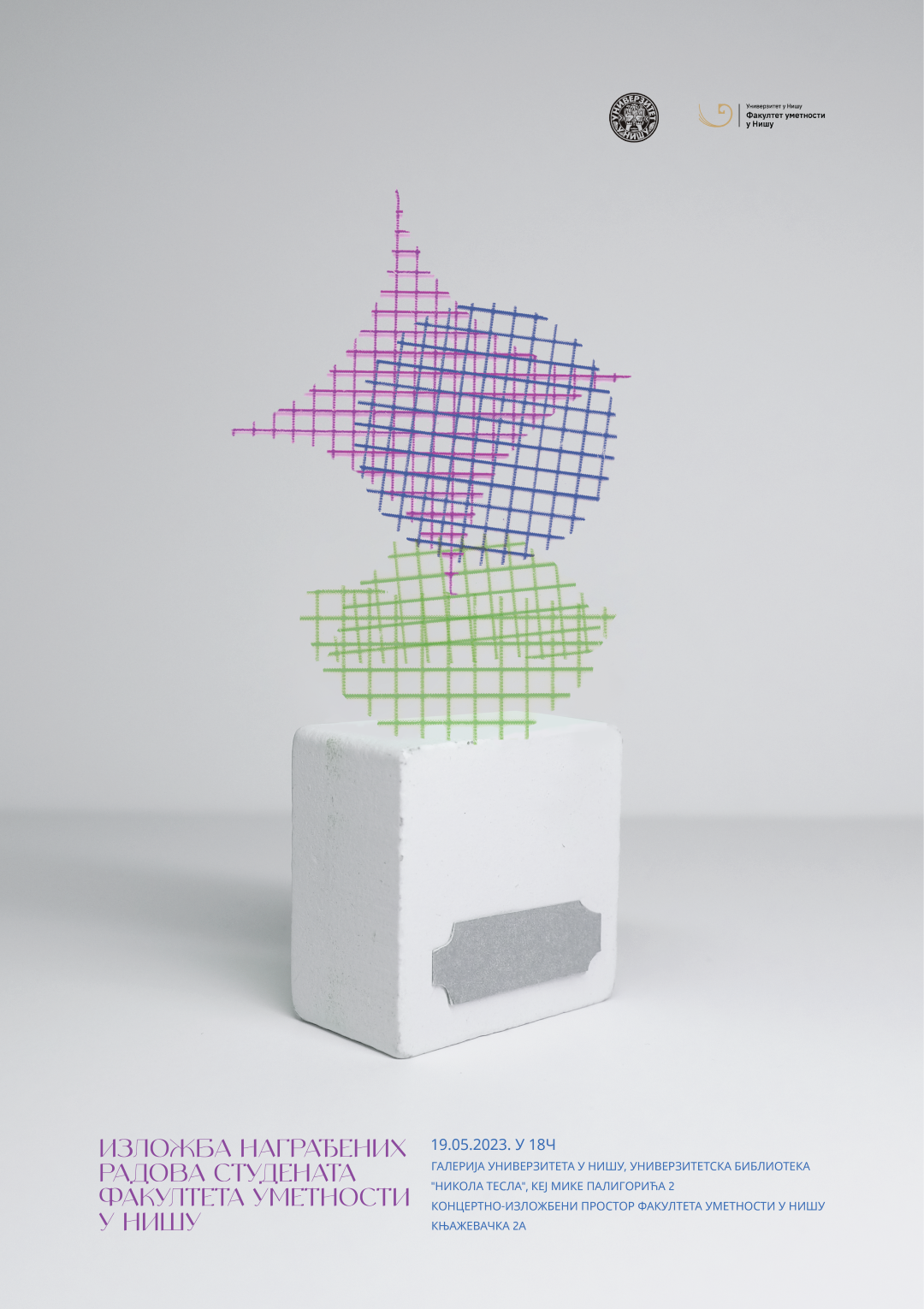 Изложба ће бити отворена 19. маја 2023. године, у 18 часова, у Галерији Универзитета у Нишу, Универзитетској библиотеци “Никола Тесла”, Кеј Мике Палигорића 2 и у Концертно-изложбеном простору Факултета уметности у Нишу, Књажевачка 2а.