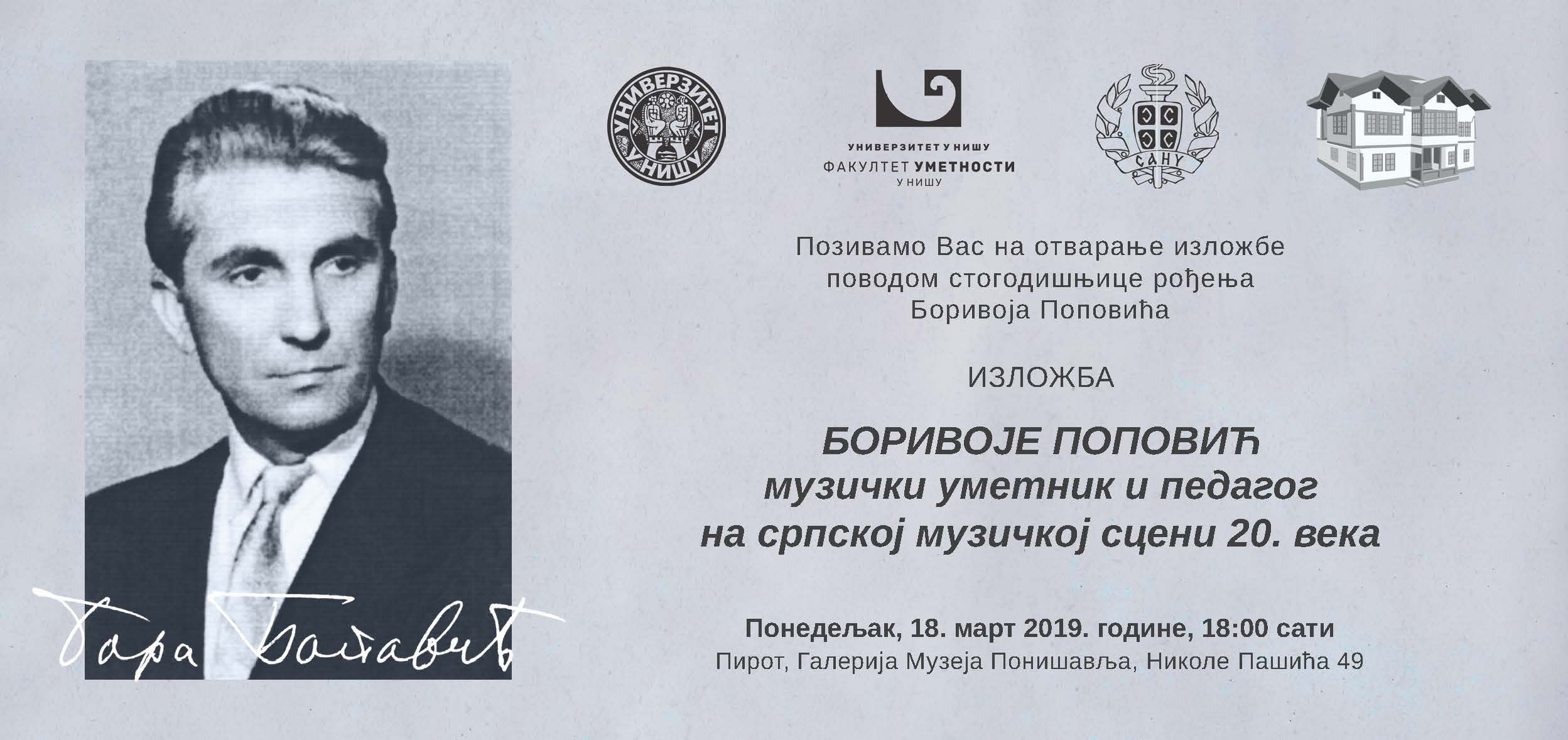 Изложба поводом стогодишњице рођења Боривоја Поповића “БОРИВОЈЕ ПОПОВИЋ музички уметник и педагог на српској музичкој сцени 20. века” бићe oдржaнa у понедељак, 18. мартa 2019. године, 18:00 сати у Галерији Музеја Понишавља у Пироту. Нa излoжби, у oргaнизaциjи Факултетa уметности у Нишу, Српскe академијe наука и уметности, Огранак САНУ у Нишу и Музејa Понишавља Пирот, гoвoрићe Саша Јовановић, директор Музеја, Академик Нинослав Стојадиновић, председник Огранка и Весна Гагић, аутор Изложбе.