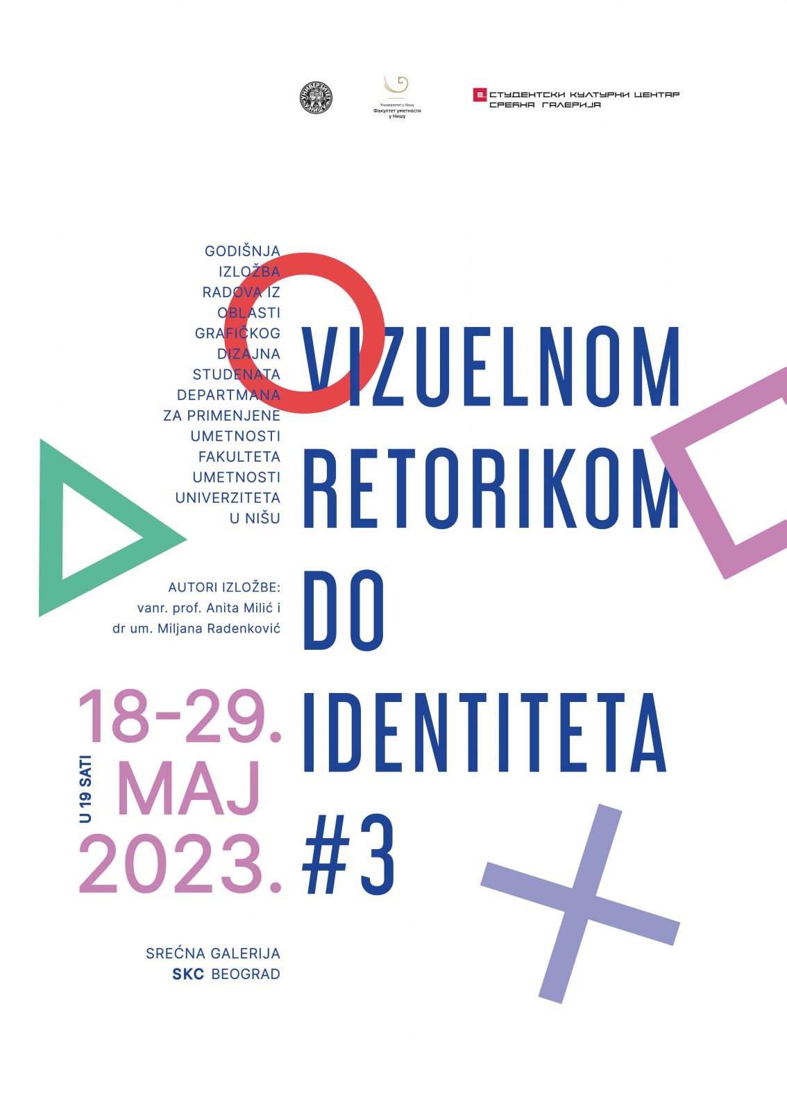 Колективна изложба радова студената Департмана за примењене уметности Факултета уметности у Нишу под називом „Визуелном реториком до идентитета #3” отворена је од 18. до 29. маја 2023. године у Срећној галерији СКЦ-а у Београду.