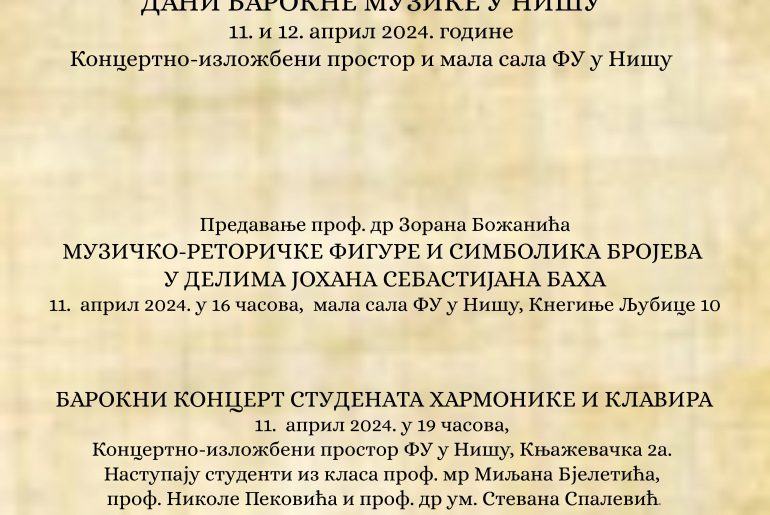 11. и 12. април 2024. године, Концертно-изложбени простор и Мала сала ФУ у Нишу Предавање проф. др Зорана Божанића МУЗИЧКО-РЕТОРИЧКЕ ФИГУРЕ И СИМБОЛИКА БРОЈЕВА У ДЕЛИМА ЈОХАНА СЕБАСТИЈАНА БАХА 11. април 2024. у 16 часова, Мала сала ФУ у Нишу, Кнегиње Љубице 10 БАРОКНИ КОНЦЕРТ СТУДЕНАТА ХАРМОНИКЕ И…