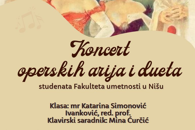 КОНЦЕРТ СЕ ОТКАЗУЈЕ ЗБОГ БОЛЕСТИ СТУДЕНАТА. Среда, 17.4.2024. год. у 19 часова, Концертно – изложбени простор Факултета уметности у Нишу, Књажевачка 2а, улаз слободан КОНЦЕРТ ОПЕРСКИХ АРИЈА И ДУЕТА Наступају студенти Одсека за соло певање Факултета уметности у Нишу из класе мр Катарине Симоновић Иванковић, ред. проф. Клавирски сарадник:…