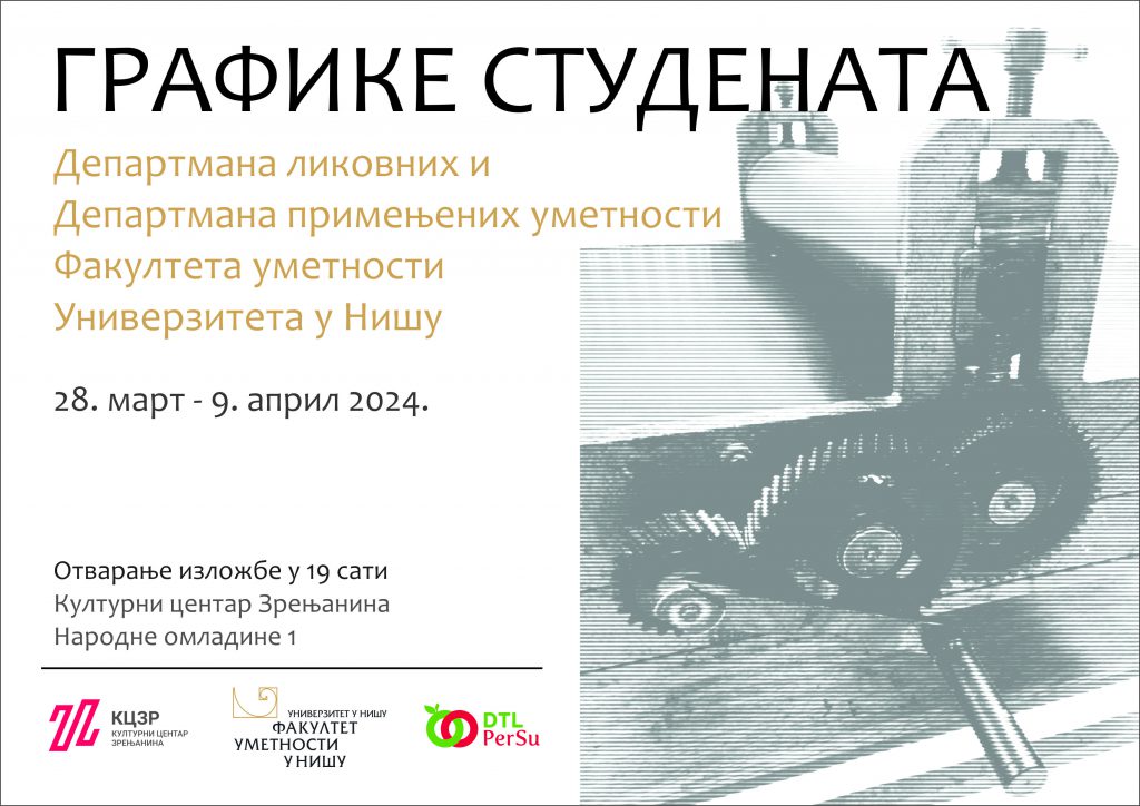 Заједничка изложба графика студената Департмана ликовних и Департмана примењених уметности Факултета уметности у Нишу, биће отворена 28. марта у изложбеном простору Културног центра Зрењанина. У поставци ће бити заступљени радови реализовани у више различитих графичких техника током протекле академске године.