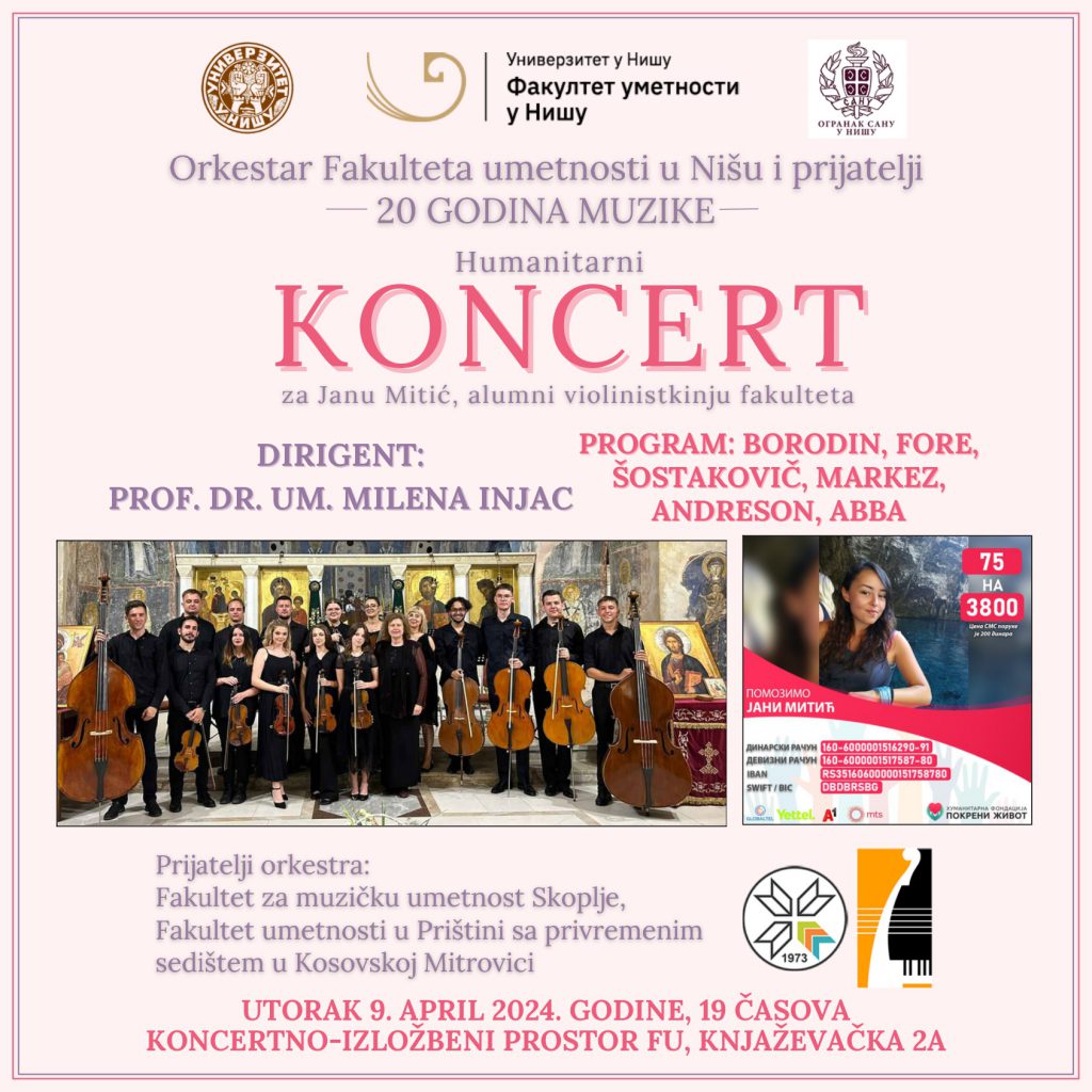 Уторак, 9. април 2024. године, 19 часова Концертно-изложбени простор ФУ, Књажевачка 2А Хуманитарни концерт за Јану Митић, алумни виолинисткињу факултета Диригент: проф. др. ум. Милена Ињац Програм: Бородин, Форе, Шостакович, Маркез, Андресон, Аба Пријатељи оркестра: Факултет за музичку уметност Скопље, Факултет уметности у Приштини са привременим седиштем у Косовској Митровици…