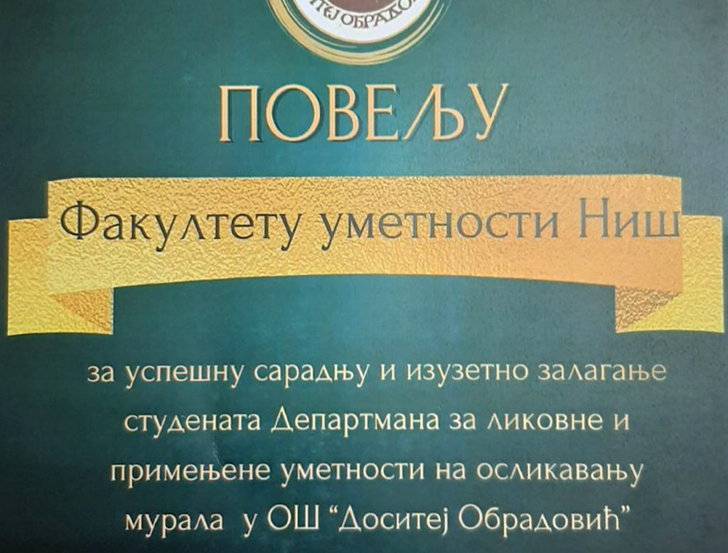 Основна школа “Доситеј Обрадовић” – Ниш додељује повељу за успешну сарадњу и изузетно залагање студената Департмана за ликовне и примењене уметности на осликавању мурала у ОШ “Доситеј Обрадовић”.