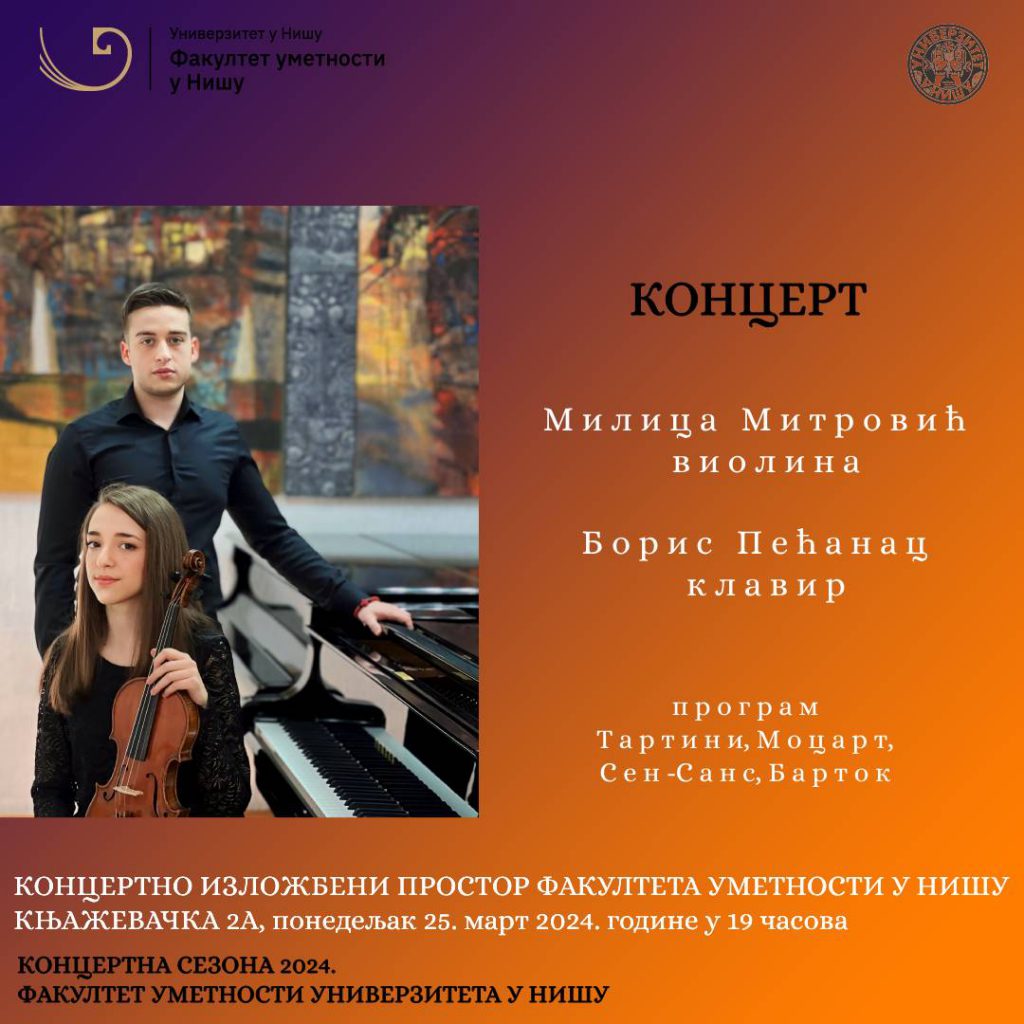 Kонцертнa сезонa Факултета уметности у Нишу 2024. – Милица Митровић, виолина и Борис Пећанац, клавир