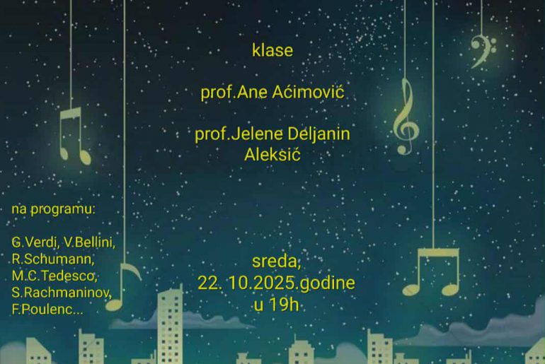 У среду, 22.10.2025.године са почетком у 19 часова, у Концертно изложбеном простору Факултета уметности, Књажевачка 2а, одржаће се концерт студената “Вече корепетитора”. Учествују студенти Катедре за клавир, из класа корепетиције проф. Ане Аћимовић и проф. Јелене Дељанин Алексић, у сарадњи студената са осталих катедри за извођаче.