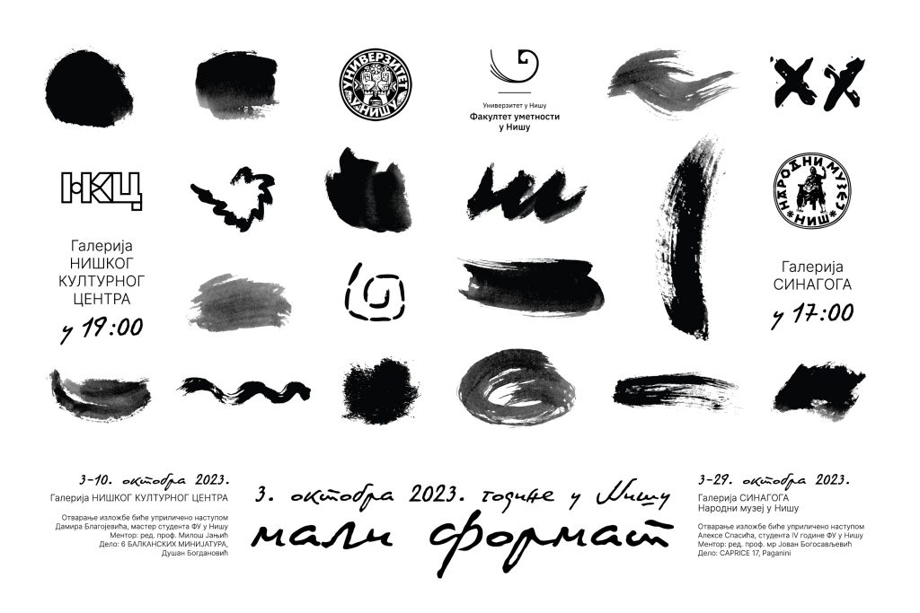 У оквиру обележавања дана Факултета уметности у Нишу, Департман за ликовне уметности заједно са Факултетом и ове године реализује изложбу студентских радова “Мали формат” са циљем успостављања континуиране излагачке праксе и сарадње са Факултетима/Академијама уметности, институцијама културе, колегама и студентима. Изложба студентских радова “Мали формат” истиче значај технике Цртежа и радова који линијом излазе у поље проширених могућности. Укључује како класичне…
