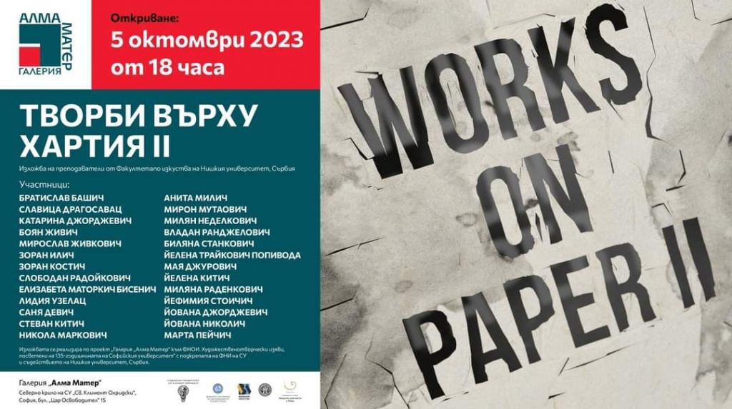 „Радови на папиру II“ изложба наставника и сарадника Факултета уметности у галерији „Алма матер“, софијског универзитета „Св. Климент Охридски“ у Бугарској