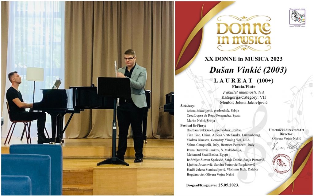 Душан Винкић, студент I године флауте ОАС у класи проф. др ум. Јелене Јаковљевић, ванредног професора, је лауреат XX Интернационалног такмичења “Donne in Musica” 2023. Душан Винкић се такмичио у VII категорији и освојио максималних 100 бодова.