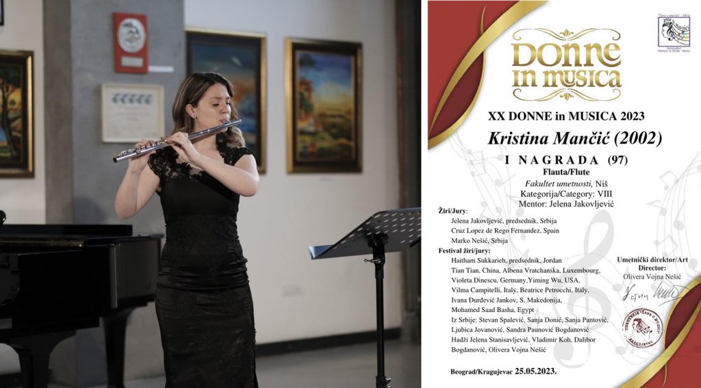 Кристина Манчић, студент друге године ОАС из класе проф. др ум. Јелене Јаковљевић, освојила је прву награду на интернационалном такмичењу “Donne in Musica” 2023. Крагујевац/Београд. Наступила је у дисциплини флаута, у VIII категорији и освојила 97 поена.