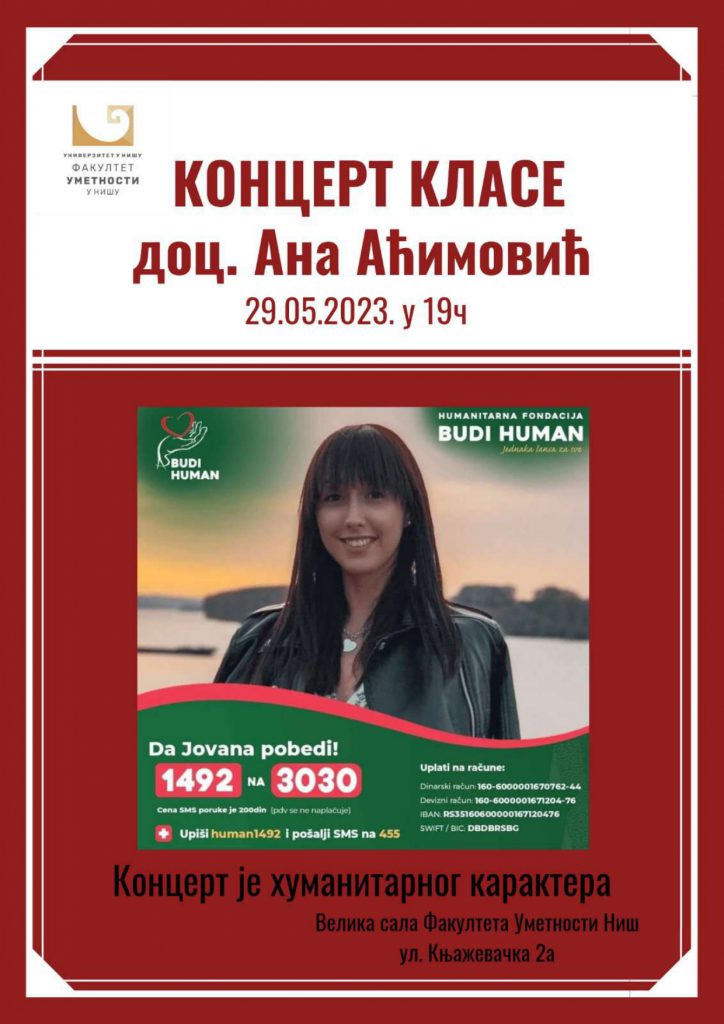 ХУМАНИТАРНИ КОНЦЕРТ За нашу виолинисткињу Јовану Павловић класа студената корепетиције доцента Ане Аћимовић 29.Мај 2023. Ниш, Концертно изложбени простор Факултета уметности 19 часова ПРОГРАМ Софија Лазић – I година Ф. Шуберт: Die forelle Клавирска сарадња: Ива Винчетијевић – I година Софија Лазић – I година М.Пребанда: Низ башчу Клавирска…