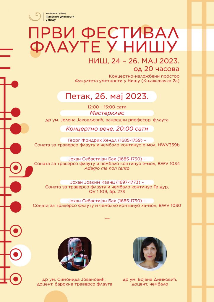 12:00 – 15:00 сати Мастерклас др ум. Јелена Јаковљевић, ванредни професор, флаута Концертно вече, 20:00 сати Георг Фридрих Хендл (1685-1759) – Соната за траверсо флауту и чембало континуо е-мол, HWV359b Grave, Allegro, Adagio, Allegro Јохан Себастијан Бах (1685-1750) – Соната за траверсо флауту и чембало континуо е-мол, BWV 1034 Adagio…