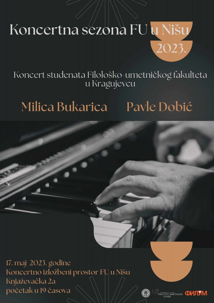 Милица Букарица и Павле Добић (клавир) 17. мај 2023. године у 19 часова Концертно-изложбени простор ФУ у Нишу (Књажевачка 2а) ПРОГРАМ Милица Букарица Јохан Себастијан Бах: Хроматска фантазија и фуга де-мол BWV 903 Л. в. Бетовен: Соната оп. 54 Еф-дур In tempo d’un menuetto Allegretto -…