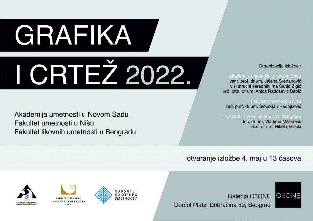 Изложба студентских радова “Графика и цртеж”, у организацији Академије уметности у Новом Саду, Факултета уметности у Нишу и Факултета ликовних уметности у Београду, биће отворена 4. маја 02. године у 13 сати, у галерији О3ОNЕ у Београду.