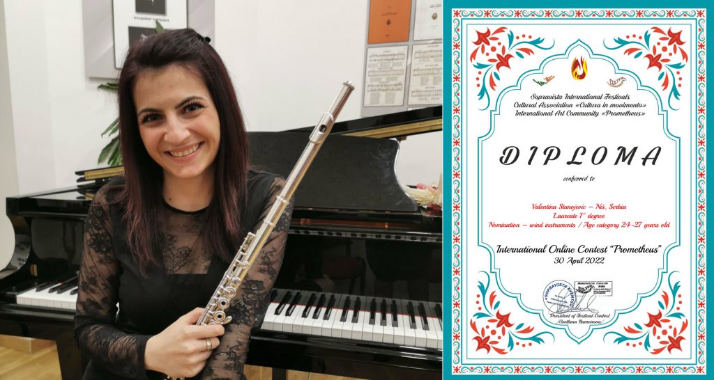 Валентина Станојевић, студенткиња на мастер студијама флауте у класи проф. мр Миомира Симоновића, освојила је Лауреат I реда на интернационалном онлајн такмичењу “Прометеус” у Италији. Честитамо!
