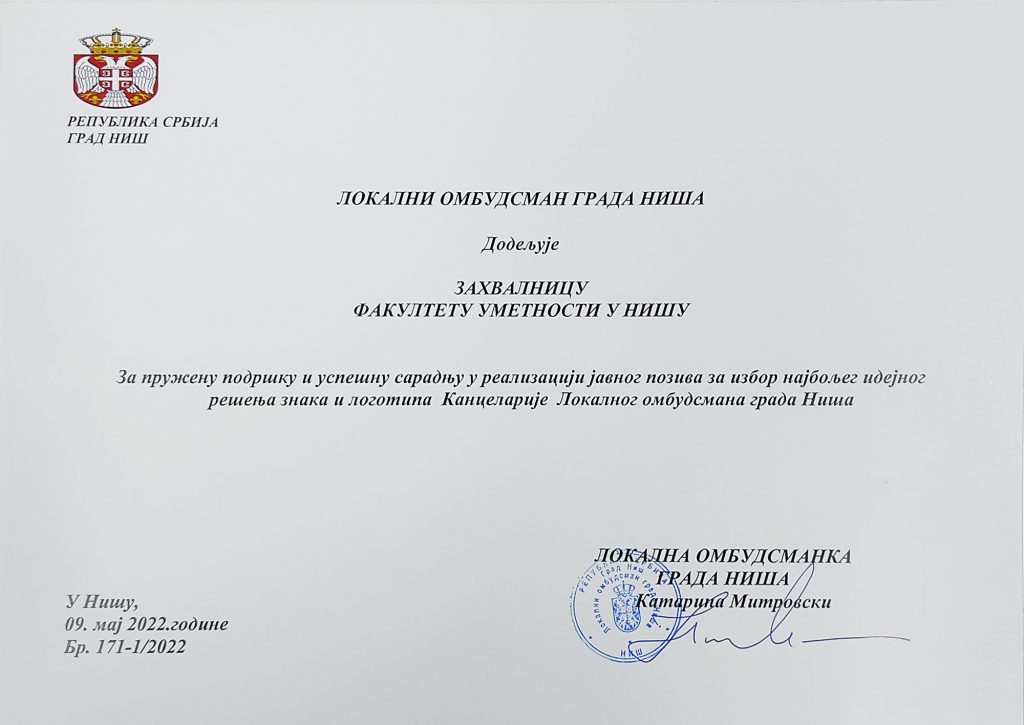 Локална омбудсманка града Ниша, Катарина Митровски, 9. маја 2022. године, доделила је захвалницу Факултету уметности у Нишу за пружену подршку и успешну сарадњу у реализацији јавног позива за избор најбољег идејног решења знака и логотипа Канцеларије Локалног омбудсмана града Ниша.