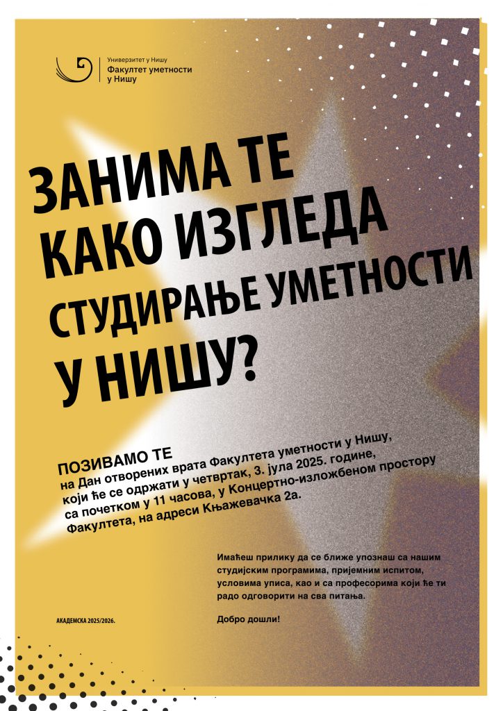 Позивамо те на Дан отворених врата Факултета уметности у Нишу, који ће се одржати у четвртак, 3. јула 2025. године, са почетком у 11 часова, у Концертно-изложбеном простору Факултета, на адреси Књажевачка 2а. Имаћеш прилику да се ближе упознаш са нашим студијским програмима, пријемним испитом, условима уписа, као и са…