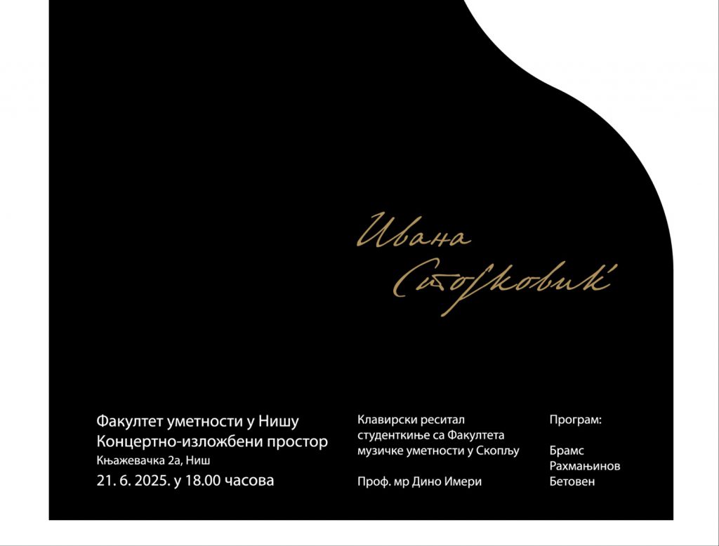 Клавирски реситал Иване Стојковик, студенткиње са Факултета музичке уметности у Скопљу, одржаће се у Концертно-изложбеном простору Факултета уметности Универзитета у Нишу, 21. јуна 2025. године са почетком у 18.00 часова. Ментор: проф. мр Дино Имери
