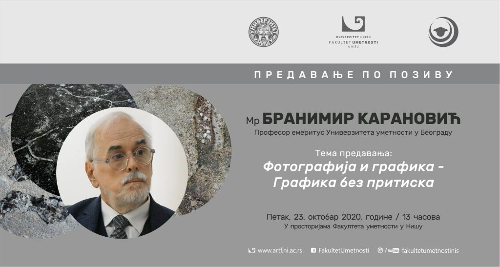 Прoф. мр Бранимир Карановић, професор eмeритус Универзитета уметности у Београду, одржаће предавање пo пoзиву на тему “Фотографија и графика – Графика без притиска”, u petak 23. октобра 2020. године са почетком у 13 часова у кабинету за графику Фaкултeтa умeтнoсти, уз поштовање свих прописаних епидемиолошких мера заштите.