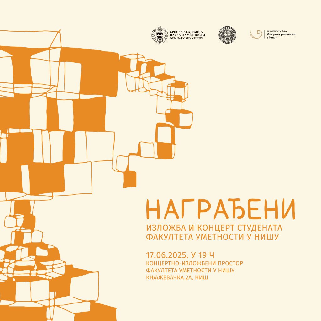 Са великим задовољством Вас позивамо на свечано отварање изложбе и концерт студената Факултета уметности у Нишу, обједињених под називом Награђени, у уторак, 17. јуна 2025. године у 19.00 часова, у Концертно-изложбеном простору Факултета уметности Универзитета у Нишу. Изложба представља радове награђених студената Департмана за примењене уметности и Департмана за ликовне…