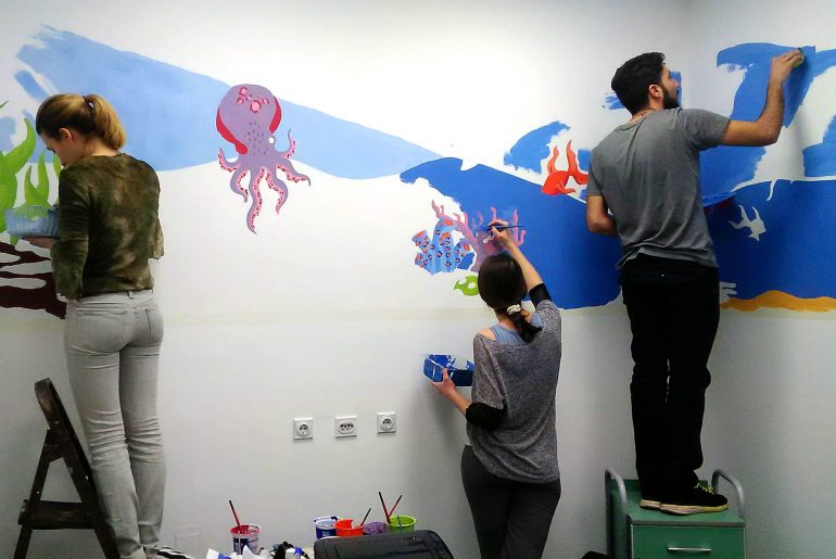Студeнти Фaкултeтa умeтнoсти oсликaвajу дeчиje oдeљeњe Клиничкoг цeнтрa у Нишу