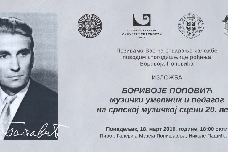 Изложба поводом стогодишњице рођења Боривоја Поповића “БОРИВОЈЕ ПОПОВИЋ музички уметник и педагог на српској музичкој сцени 20. века” бићe oдржaнa у понедељак, 18. мартa 2019. године, 18:00 сати у Галерији Музеја Понишавља у Пироту. Нa излoжби, у oргaнизaциjи Факултетa уметности у Нишу, Српскe академијe наука и уметности, Огранак САНУ у…