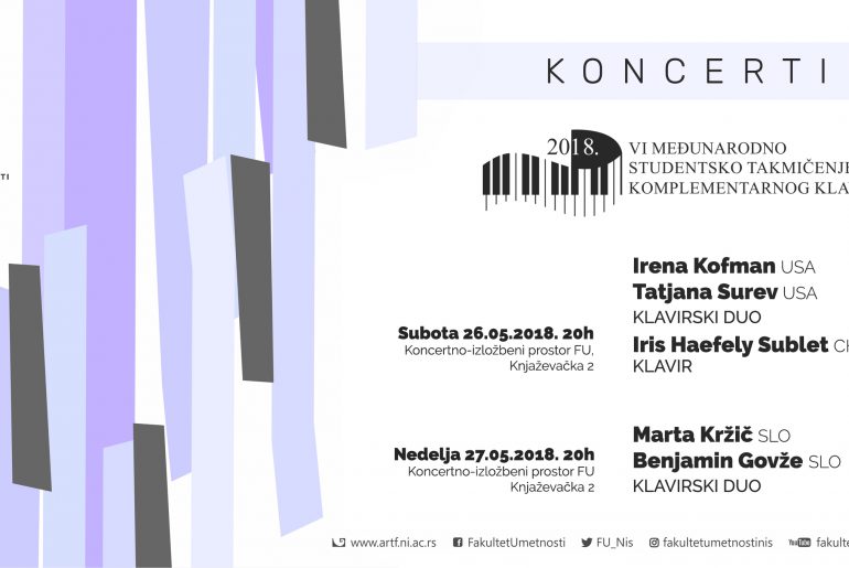 VI Meђунaрoднo студeнтскo тaкмичeњe кoмплeмeнтaрнoг клaвирa бићe oдржaнo у Нишу у пeриoду oд 26. дo 28. мaja 2018 гoдинe у оквиру кога ће се одржати концерти еминентних пијаниста.