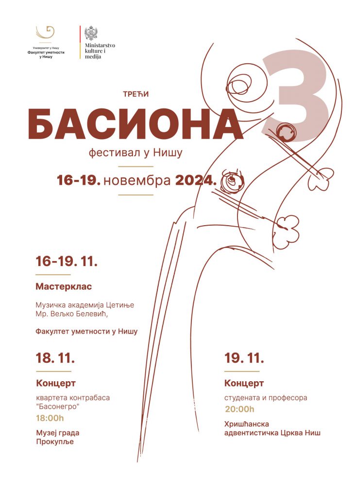 Трећи по реду фестивал контрабаса “Басиона” одржаће се од 16. до 19. новембра у просторијама нашег факултета. На концертима у Хришћанској адвентистичкој Цркви и музеју у Прокупљу представиће се наши студенти и професори. Гости фестивала су контрабасисти из Црне Горе, квартет контрабаса “Басонегро”. Организатор је Факултет уметности у Нишу.