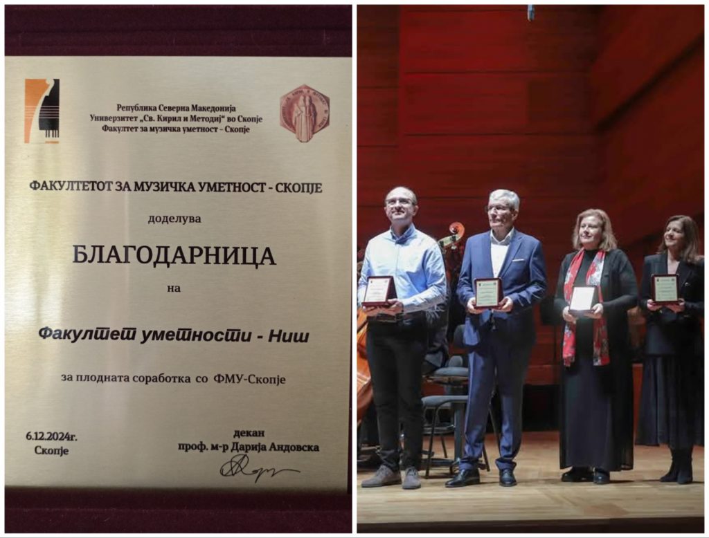 Факултет уметности награђен је Благодарницом Факултета музичке уметности Универзитета “Св. Кирил и Методиј” из Скопља поводом прославе 58. годишњице постојања и успешног рада ове значајне установe. Високо признање је испред Факултета уметности примила деканица проф. др ум. Милена Ињац, којој је Благодарницу уручила деканица ФМУ Скопље проф. мр Дарија Андовска…
