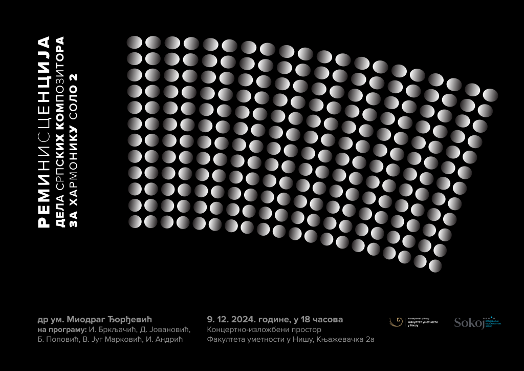 9. децембар 2024. год. у 18 часова, Концертно-изложбени простор ФУ у Нишу, Књажевачка 2а На програму: Бркљачић, Јовановић, Поповић, Југ Марковић, Андрић Овај концерт финансијски је подржао СОКОЈ, Фонд за културна давања