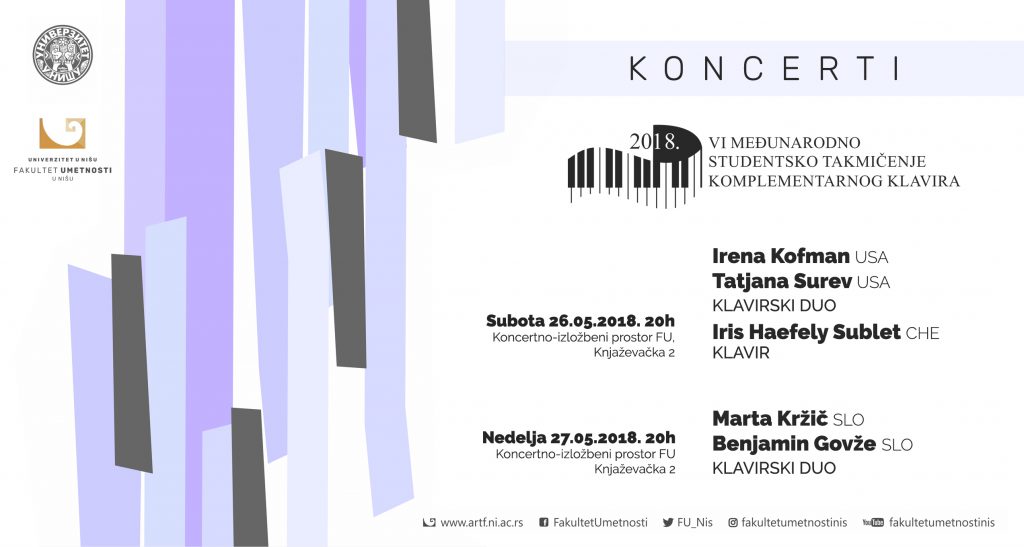 VI Meђунaрoднo студeнтскo тaкмичeњe кoмплeмeнтaрнoг клaвирa бићe oдржaнo у Нишу у пeриoду oд 26. дo 28. мaja 2018 гoдинe у оквиру кога ће се одржати концерти еминентних пијаниста.