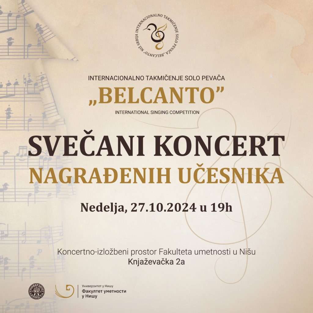 Свечани концерт награђених учесника “Belcanto” такмичења биће одржан у недељу 27. октобра у 19 часова, у&нбсп; Концертно-изложбеном простору Факултета уметности у Нишу, Књажевачка 2а.