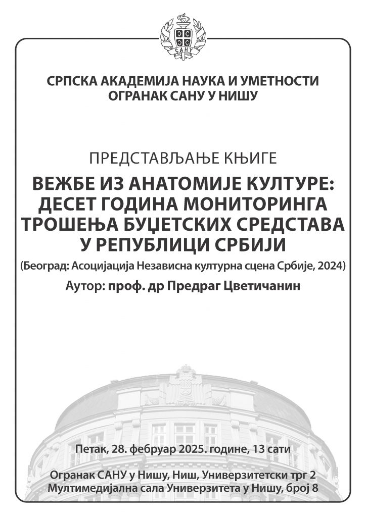 Четвртак, 28. фебруар 2025. године, 13 сати Мултимедијална сала Универзитета у Нишу Представљање књиге „Вежбе из анатомије културе: Десет година мониторинга трошења буџетских средстава у Републици Србији“ Аутор: проф. др Предраг Цветичанин (Београд: Асоцијација Независна културна сцена Србије, 2024) С а ж е т а к Kњига…