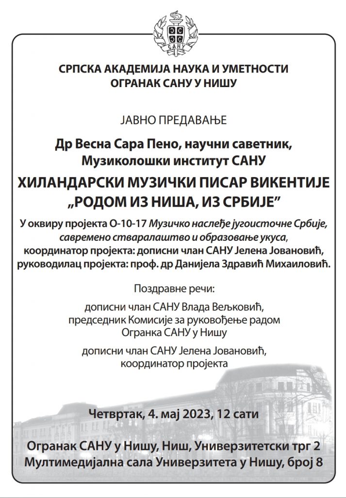Др Весна Сара Пено, научни саветник Музиколошког института САНУ, одржаће предавање на тему ХИЛАНДАРСКИ МУЗИЧКИ ПИСАР ВИКЕНТИЈЕ „РОДОМ ИЗ НИША, ИЗ СРБИЈЕ“. Предавање се реализује у оквиру пројекта О-10-17 Музичко наслеђе југоисточне Србије, савремено стваралаштво и образовање укуса (координатор пројекта: дописни члан САНУ Јелена Јовановић, руководилац пројекта: проф. др Данијела…