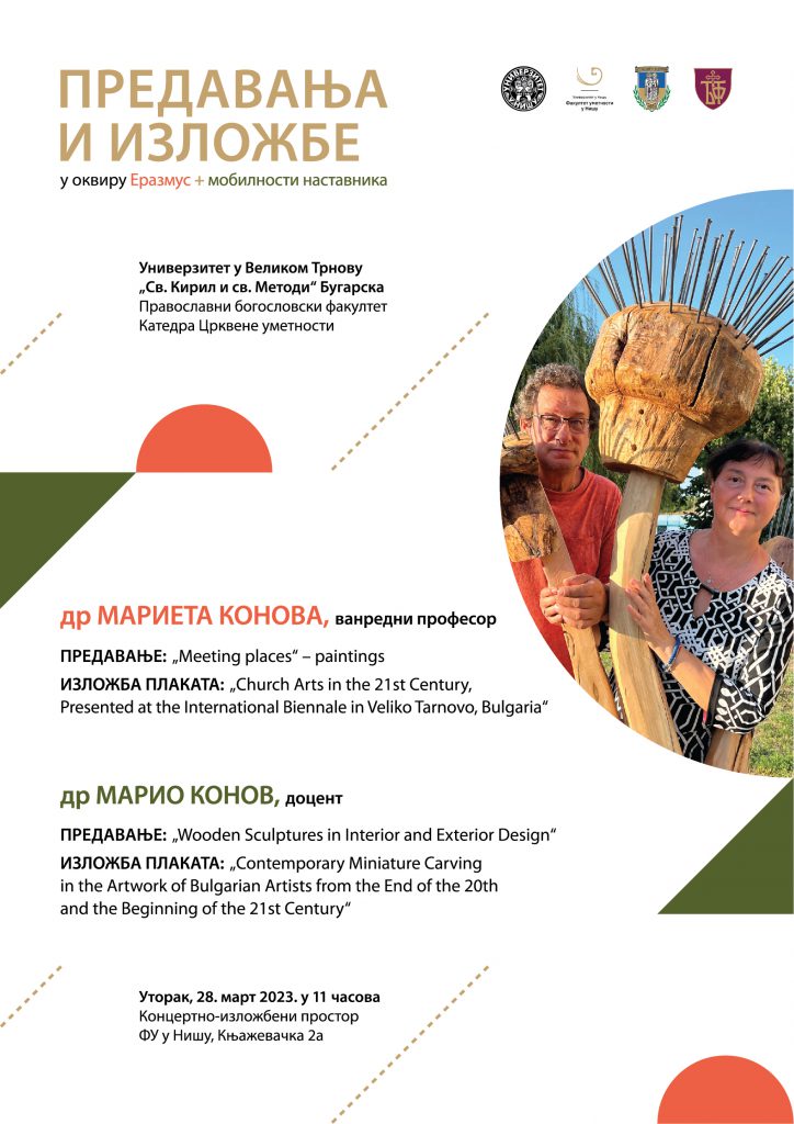 У оквиру Еразмус+ програма мобилности наставника, у уторак 28.3.2023. године у Концертно-изложбеном простору Факултета уметности у Нишу, одржаће се предавања и изложбе плаката др Мариете Конове, ванредног професора и др Марија Конова, доцента на Православном богословском факултету Универзитета у Великом Трнову „Св. Кирил и св. Методи“ (Бугарска). др Мариета Конова, ванредни професор Предавање:…