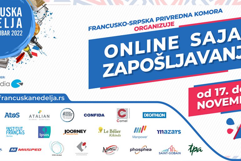Француско-српска привредна комора са задовољством најављује седмо издање Онлајн сајма запошљавања, који це се одржати у склопу Француске недеље, од 17. до 23. новембра, на платформи : www.francuskanedelja.rs. На овогодишњем онлајн сајму запошљавања који стартује 17. новембра учествоваће француска, српска и друга интернационална предузећа као што су: Atos, Saint-Gobain, Le Belier, Joorney Business Plans, Heloo,…