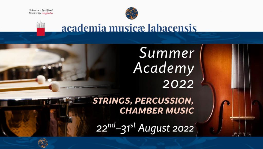 Музичка академија Универзитета у Љубљани организује Летњу школу за виолинисте, виолисте, виолончелисте и перкусионисте од 22. до 31. августа 2022. године. Више информација на https://www.summerschool.ag.uni-lj.si/. Пријављивање на https://www.summerschool.ag.uni-lj.si/application.