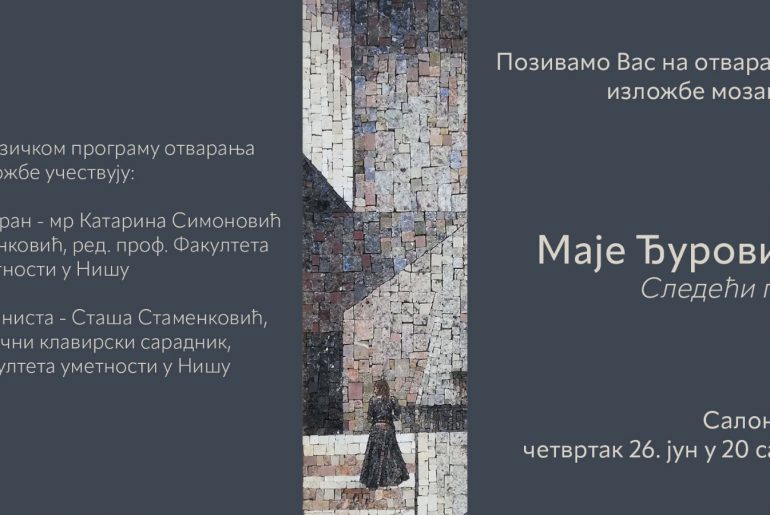 Позивамо Вас на отварање изложбе мозаика Маје Ђуровић “Следећи пут” Салон 77, четвртак 26. јун у 20 сати У музичком програму отварања изложбе учествују: Сопран – мр Катарина Симоновић Иванковић, ред. проф. Факултета уметности у Нишу Пијаниста – Сташа Стаменковић, стручни клавирски сарадник, Факултета уметности у Нишу