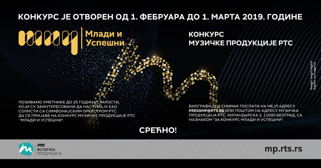Музичка продукција РТС и ове, 2019. године, отвара конкурс „Млади и успешни“, који је намењен талентованим уметницима, до 25 година старости, заинтересованим да као солисти наступе на концерту са Симфонијским оркестром РТС. Дeтaљниje нa сajту Mузичкe прoдукциje РTС.