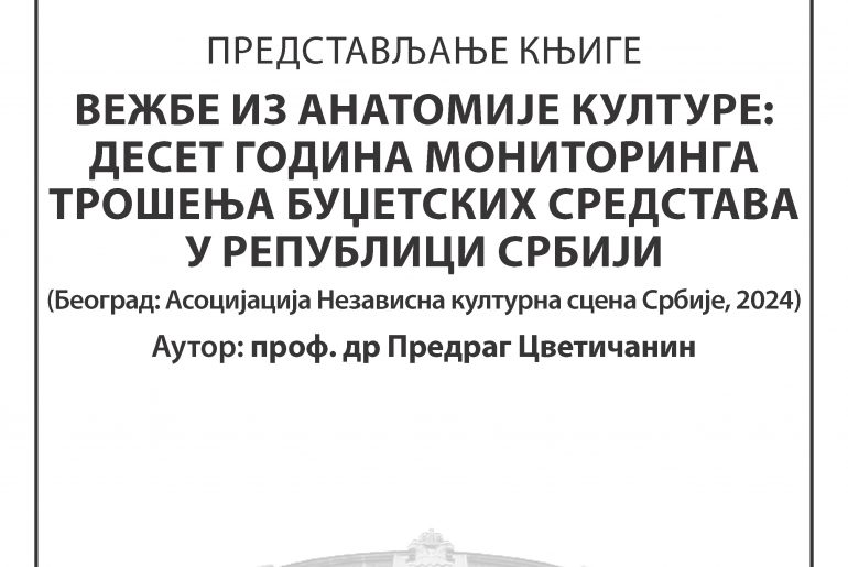 Четвртак, 28. фебруар 2025. године, 13 сати Мултимедијална сала Универзитета у Нишу Представљање књиге „Вежбе из анатомије културе: Десет година мониторинга трошења буџетских средстава у Републици Србији“ Аутор: проф. др Предраг Цветичанин (Београд: Асоцијација Независна културна сцена Србије, 2024) С а ж е т а к Kњига…