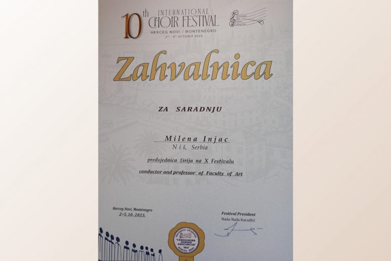 Проф. др ум. Милена Ињац, диригент и декан Факултета уметности у Нишу, била је председник жирија јубиларног 10. Међународног фестивала хорова у Херцег Новом у Црној Гори. Чланови жирија су били Јасенка Остојић (Хрватска), Енрико Миарома (Италија) и Јарун Бекерс (Белгија). Фестивал је одржан од 2. до 5. октобра 2025.…