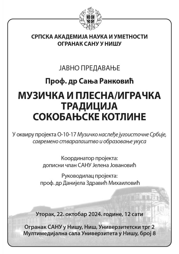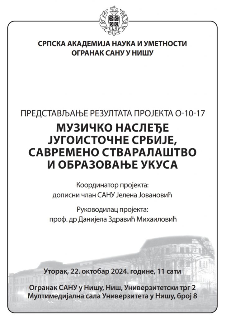 Представљање резултата истраживања на пројекту „Музичко наслеђе југоисточне Србије, савремено стваралаштво и образовање укуса“ (О-10-17), чији је координатор дописни члан САНУ Јелена Јовановић, а руководилац проф. др Данијела Здравић Михаиловић, одржаће се у уторак, 22. октобра 2024. године у 11 часова (Огранак САНУ у Нишу, Универзитетски трг 2, Мултимедијална сала…