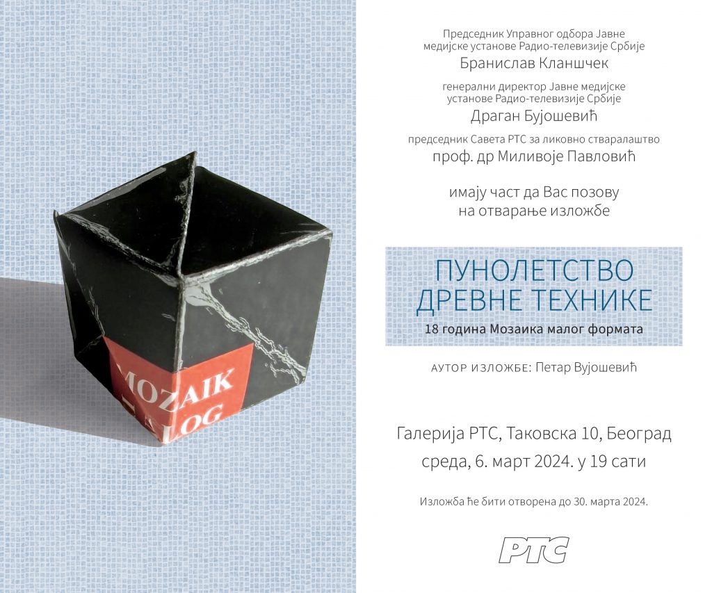 У Галерији Радио-телевизије Србије 6. марта отворена је изложба под називом Пунолетство древне технике – 18 година Мозаика малог формата. На изложби је представљено више од 70 мозаика малог формата уметника из Србије и Европе које је аутор Петар Вујошевић изабрао са претходно одржаних манифестација ове традиционалне међународне изложбе. Мозаик…