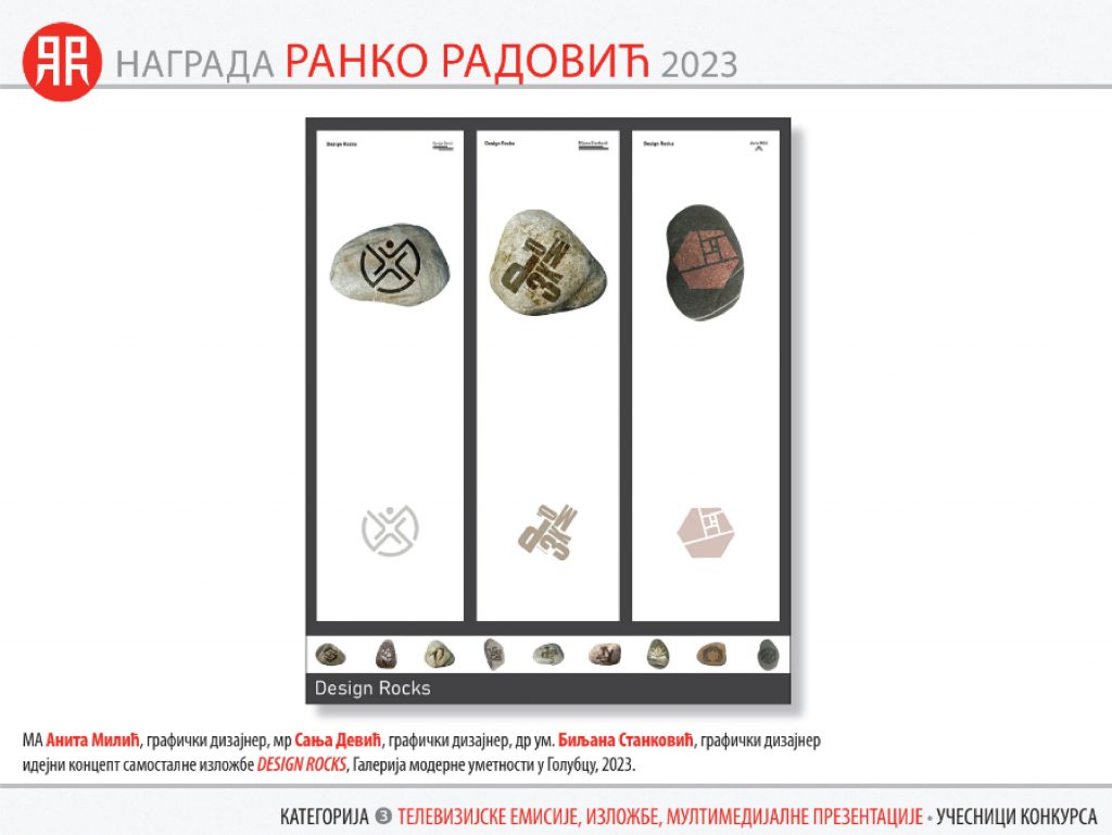 На овогодишњој изложби конкурсних радова ”Награде Ранко Радовић у 2023. години”, свој пројекат “Design Rocks” представиле су ванредне професорке Факултета уметности у Нишу, Анита Милић, Сања Девић и Биљана Станковић. Пројекат је премијерно приказан на самосталној изложби у Галерији модерне уметности у Голупцу 2023. године. Ауторке су свој рад представиле…