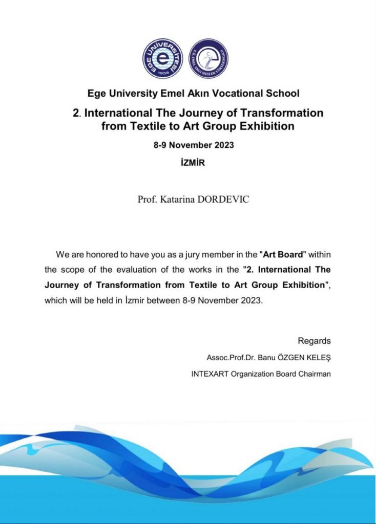 Проф. мр Катарина Ђорђевић учествује по позиву у раду интернационалног уметничког жирија на 2nd International the Journey of Transformation from Textile to Art Group Exhibition у организацији Ege University, Измир, Турска. Изложба ће бити реализована у периоду 8-9. новембра 2023. године у галерији INTEXART у Измиру.