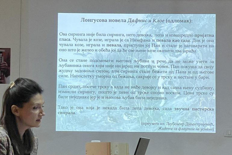 Мср Марија Томић, истраживач-сарадник и сарадник у настави на Катедри за музикологију Факултета музичке уметности Универзитета уметности у Београду, и алумни Факултета уметности Универзитета у Нишу, одржала је предавање по позиву на тему “Фигура Пана у француској музици fin desiecle-а”. Предавање је одржано у оквиру Првог Фестивала Флауте у Нишу.