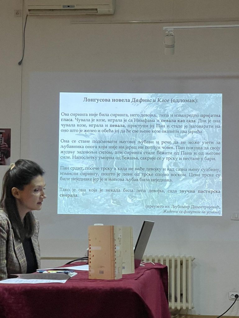 Мср Марија Томић, истраживач-сарадник и сарадник у настави на Катедри за музикологију Факултета музичке уметности Универзитета уметности у Београду, и алумни Факултета уметности Универзитета у Нишу, одржала је предавање по позиву на тему “Фигура Пана у француској музици fin desiecle-а”. Предавање је одржано у оквиру Првог Фестивала Флауте у Нишу.