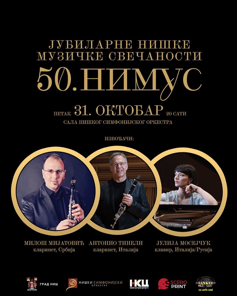 Милош Мијатовић, редовни професор Факултета уметности Универзитета у Нишу, и Антонио Тинели, професор на конзерваторијуму „Niccoló Piccinni“ Универзитета у Барију, одржали су целовечерњи концерт на јубиларном 50. НИМУС-у. Клавирска сарадња: Јулија Мосејчук (Русија/Италија) На програму су била дела италијанских композитора: Г. Росини, Л. Басии, М. Мангани, В. Фарина — премијера…